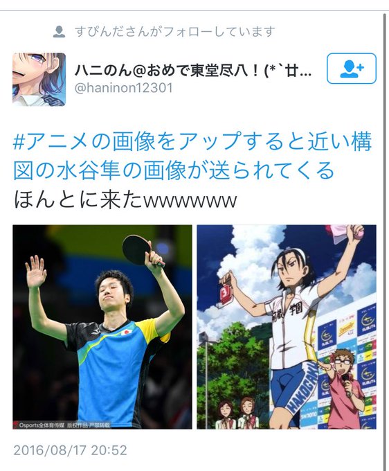 ゆうに オルサガ綺羅 さん がハッシュタグ アニメの画像をアップすると近い構図の水谷隼の画像が送られてくる をつけたツイート一覧 1 Whotwi グラフィカルtwitter分析